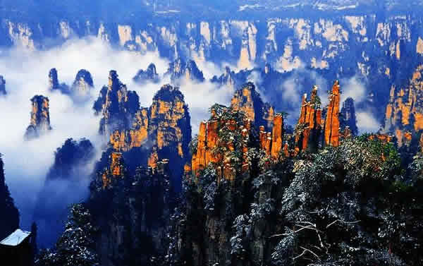 御筆峰 御筆峰被公認為是武陵源砂巖大峰林風光的標志景點,不斷出現(xiàn)在海內(nèi)外各種媒體和宣傳品上面,堪稱天下一絕。本來,這是大自然鬼斧神工的神來之筆,科學(xué)上講是歲月風化、浸蝕、切[1]削的結(jié)果,但民間卻把它與向王天子聯(lián)系在一起,說是向王天子殉難后,他的御筆化成石峰,廝守在神堂灣邊;而裝御筆的“簽筒”、“筆架”則留在水繞四門。然而,千古興亡,時代更迭,“古今多少事,都付笑淡中”。只有這支“御筆”還在!在詩人眼中,好用它來寫瀟瀟灑灑的霧,寫多姿多彩的云,寫火一般熱烈的朝霞,寫夢幻般純潔的月光,寫“高處不勝寒”的冰雪世界。當然,也可以寫您熱戀這方山水或者熱戀某位紅顏知己的情詩。