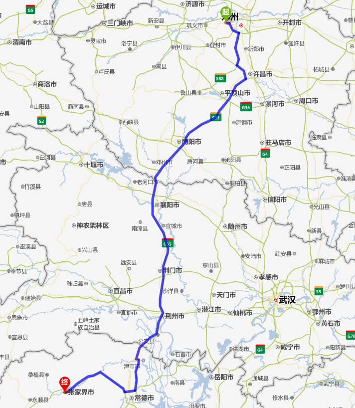 左右,沿途經過滎陽——平頂山——南陽——襄陽——荊門——荊州——常德(也可以走國道經澧縣、石門縣)——慈利——張家界。