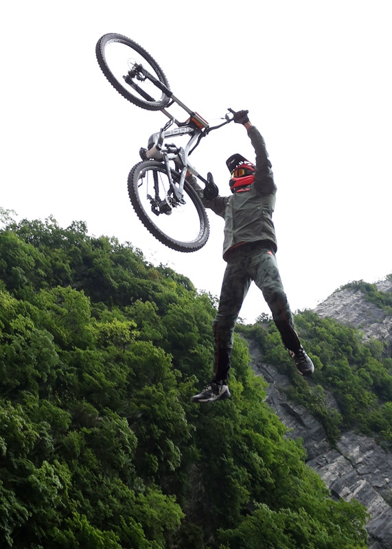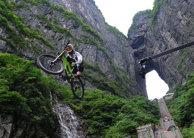 張家界天門山天門洞,999級臺(tái)階,以39°斜坡筆直往下,看一眼都覺得眩暈。如果有人騎著山地車一路沖下來,你一定會(huì)說“瘋了!”。
